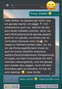 „Hallo Stefan, du glaubst gar nicht, was ich gerade mache. Ich jogge! Ich unterbreche auch nur, weil ich dir das jetzt direkt mitteilen möchte. Jetzt, wo mein Motivationsschub gerade gaaanz groß ist. Ich glaube, so extrem war es nach einer Hypnose noch nie klappt im Moment einfach alles, toi, toi, toi: die Portionsgröße beim Essen ist gut ( ich meine natürlich reduziert); weitere Gewichtsabnahme; Entspannung ist super; auf dem Crosstrainer für mich höchste Leistungsstufe, und wie gesagt jetzt wieder das Joggen. Auch mit dem Schreiben geht es vorwärts. Ich bin dir echt Dankbar.“