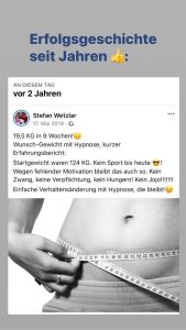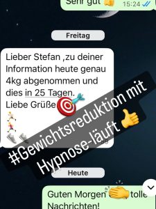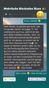 Dabei hatte ich nicht an Hypnose geglaubt und dass ich meine Essgewohnheiten so einfach umstelle. 1000 mal DANKE! Bis in 3Wochen